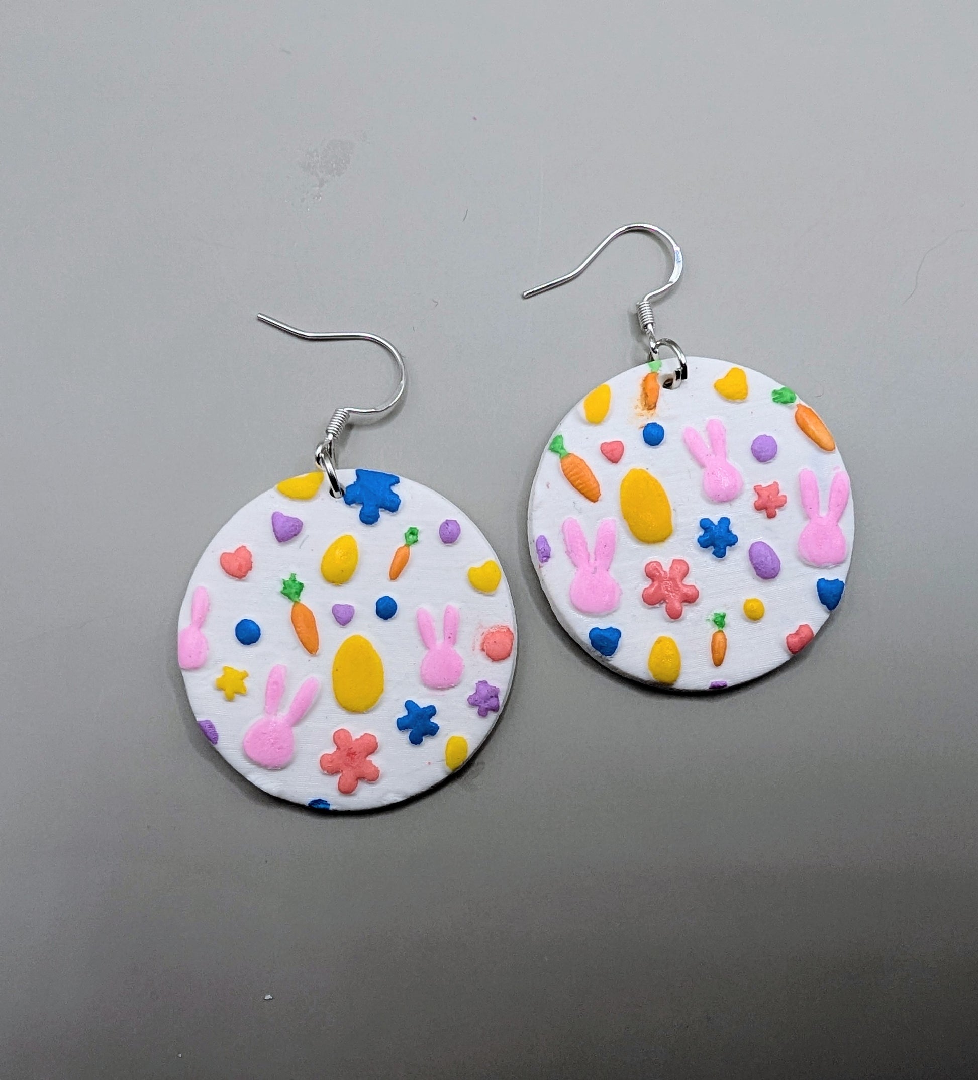 Made from polymer clay and hand painted. These feature a series of hand painted Easter shapes in different colours. On sterling silver hooks. Limited release