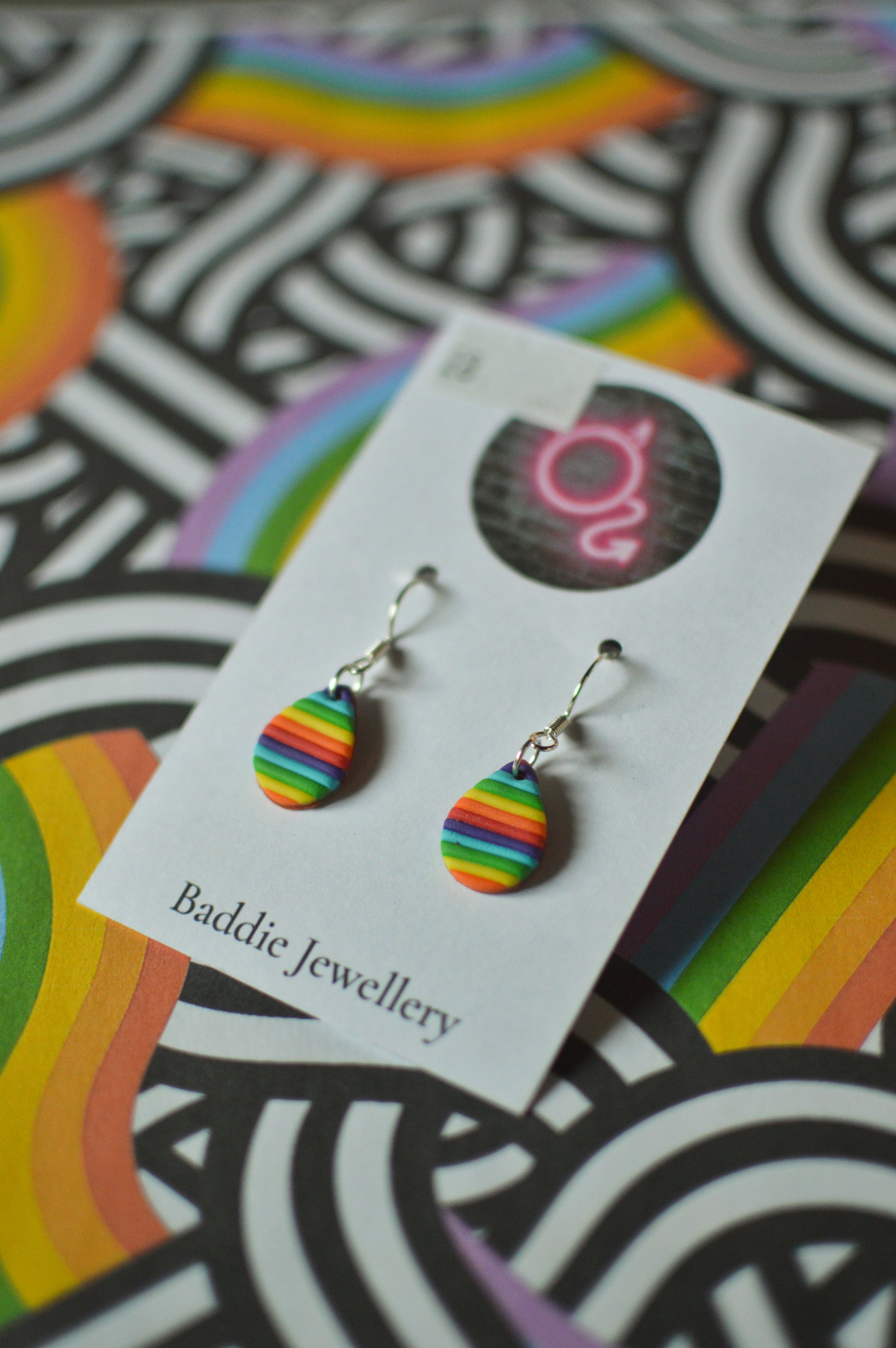 Add a colorful touch to your wardrobe with these handmade Rainbow Tear Drop Earrings. Made from polymer clay, these quirky earrings feature a playful tear drop design in a vibrant rainbow hue. Perfect for brightening up any outfit (and your day)!