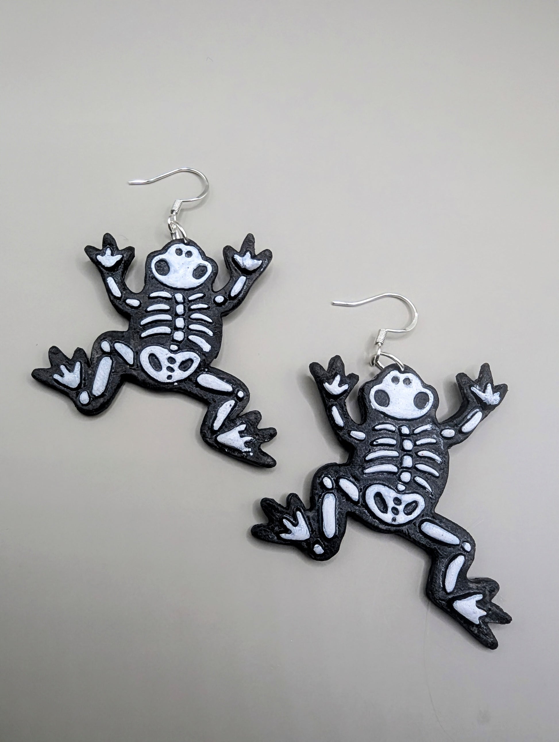These handmade earrings feature funky Skeleton Frog designs crafted from durable polymer clay. Add a unique touch to your style with these quirky and playful earrings. Ribbit your way to a killer look!
