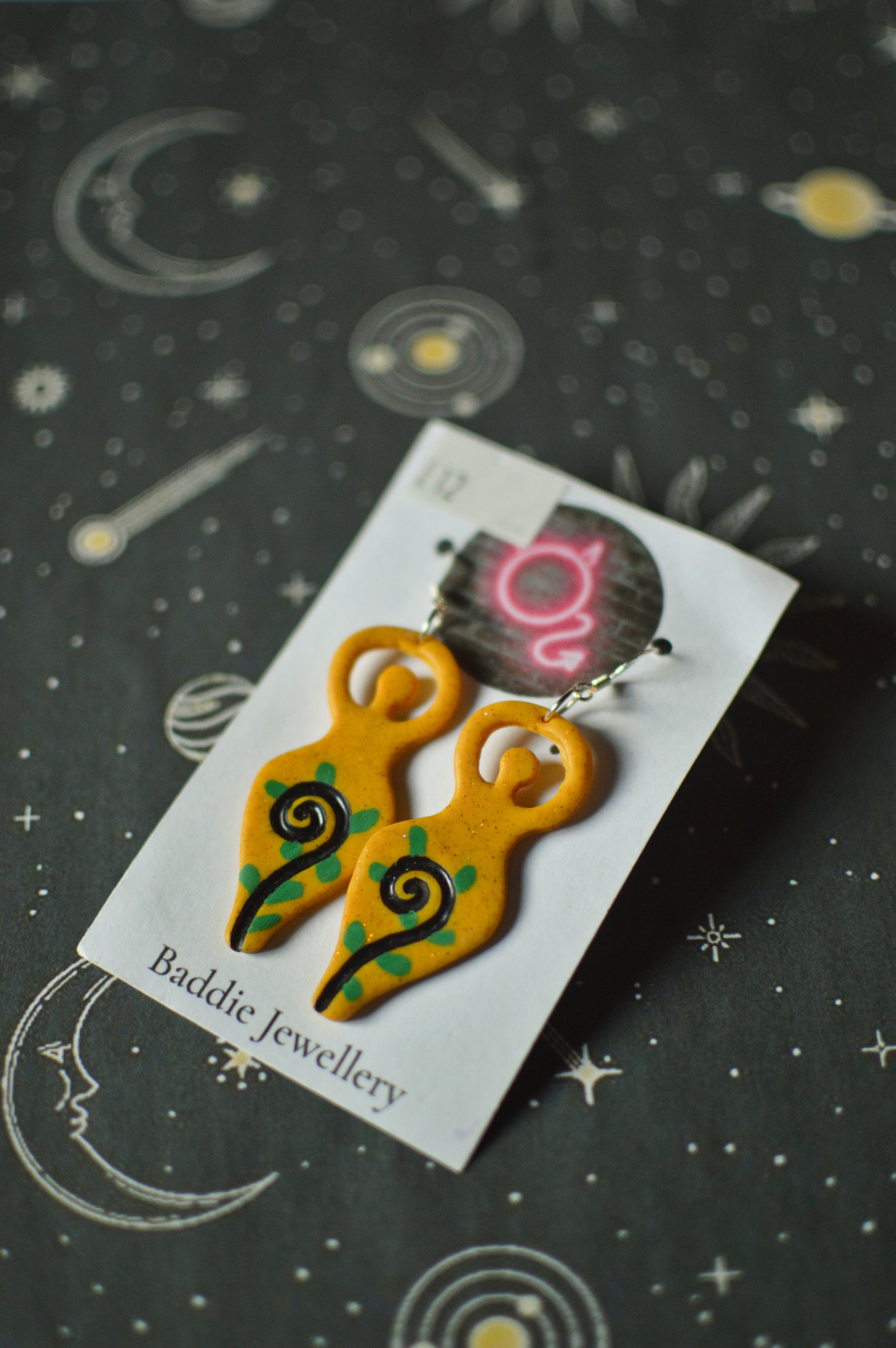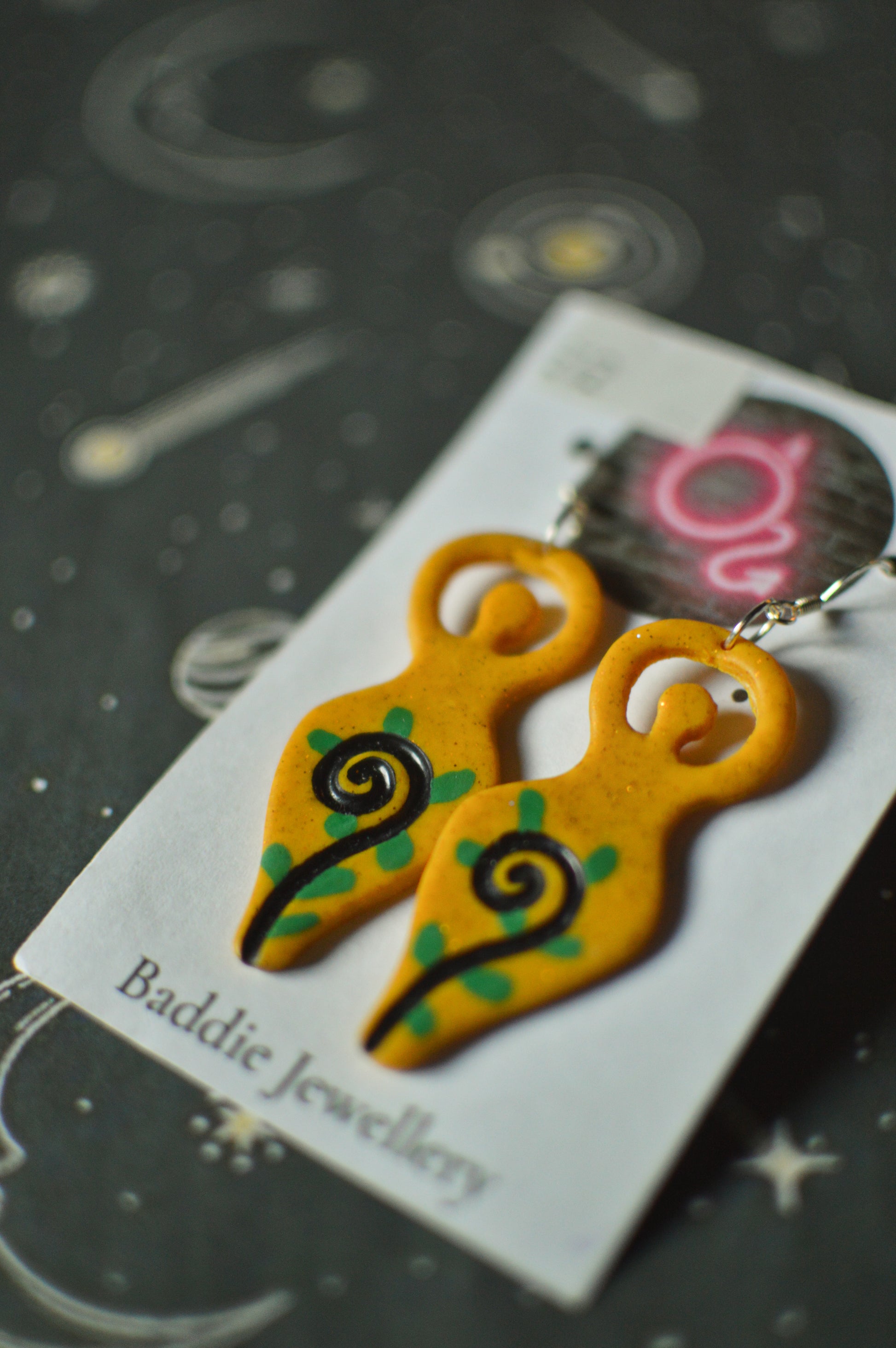 Bask in the handmade beauty of these Sun Goddess earrings, crafted from polymer clay. The goddess bodies add a unique touch to any outfit.