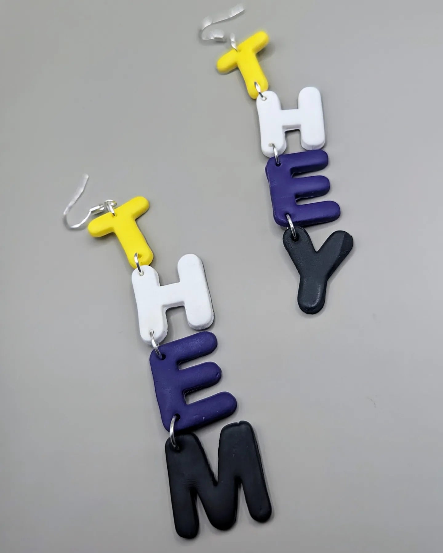 These They/Them Pronoun Earrings are a handmade statement of non-binary identity. Made with polymer clay, each earring proudly displays the They/Them pronouns, allowing for self-expression and representation. Perfect for individuals who identify as non-binary and their allies.